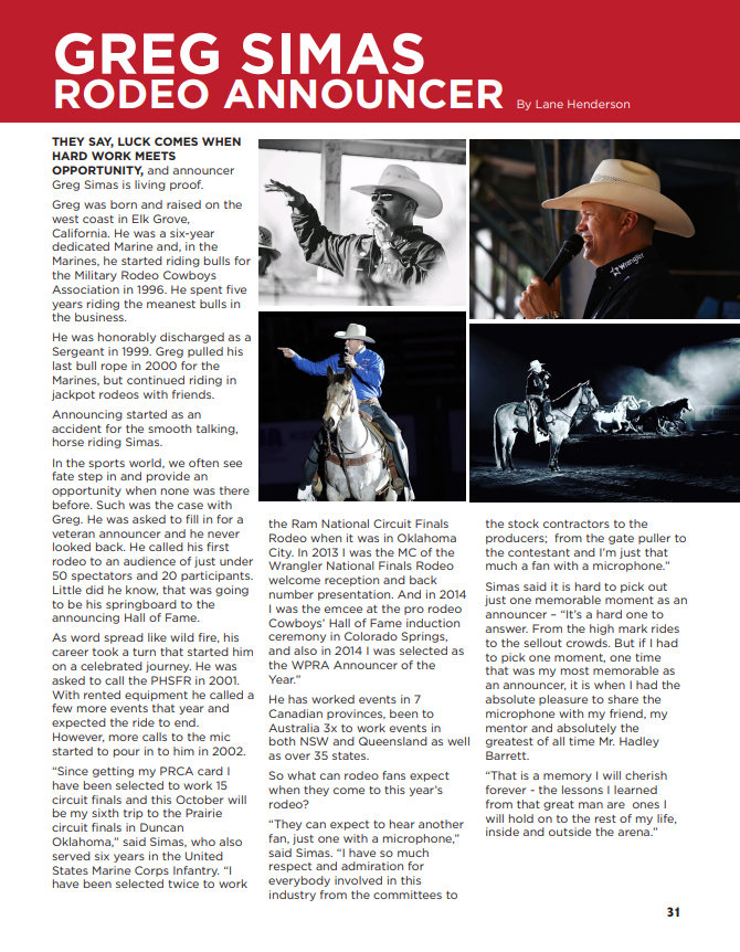 Greg Simas has announced rodeos in seven different cities in Australia, seven Canadian Provinces, over 34 US States, and twice at the Ram National Circuit Finals! He is a 15x PRCA Circuit Finals Announcer and 2x Ram National Circuit Finals Rodeo Announcer.
